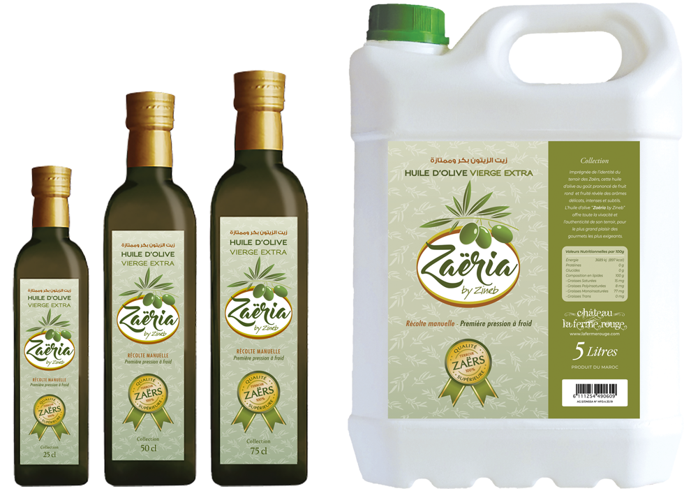 Issue d’olives de variété marocaine, cueillies manuellement en début de saison sur le domaine Château la Ferme Rouge, au coeur de la région des Zaërs, cette huile exprime un fruité vif avec arômes ardents, intenses, délicats et une note poivrée en fin de bouche. De qualité unique, authentique et naturelle, l’huile d’olive “Zaëria by Zineb” offre toute la vivacité de son terroir, sa noblesse et sa finesse, pour le plus grand plaisir des gourmets les plus exigeants.